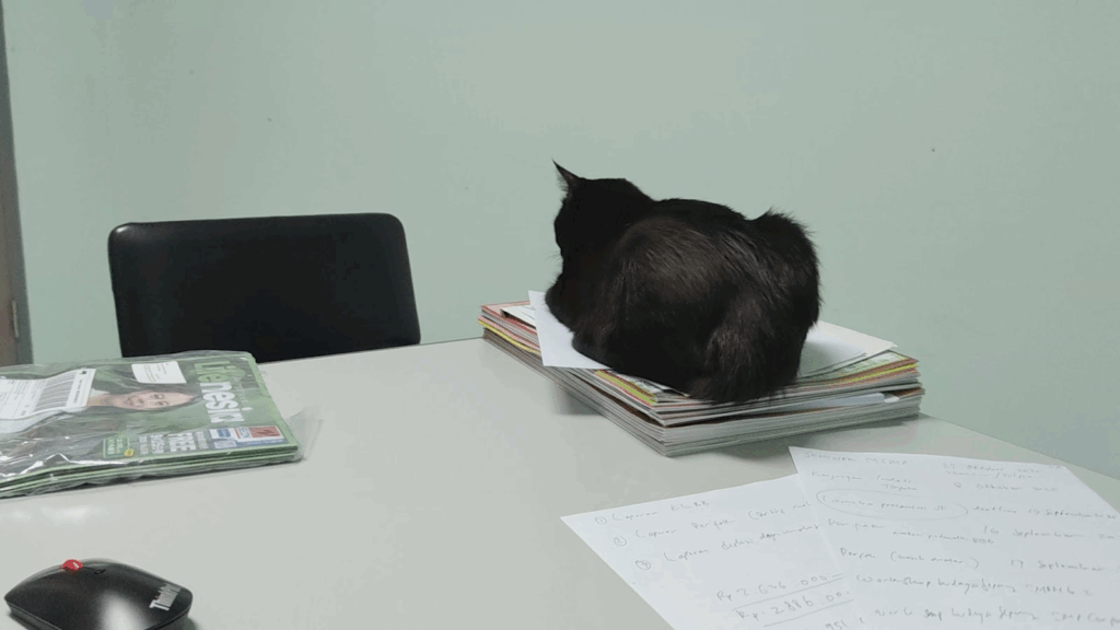 Halo semua, apa kabarnya? Semua pasti sehat ya. Apa kalian masih ingat kucing hitam yang suka masuk ke ruangan saya. Dia masih suka masuk ke ruangan saya dan kayanya dia makin nyaman. Sekarang dia suka naik ke pangkuan saya. Terus dia juga suka tidur di atas meja kerja. Kucing ini hidup di lingkungan kampus, jadi ya badannya relatif bersih sih. Karena itu saya nggak keberatan dia ada di dalam ruangan saya. Kucing ini kayanya kucing campuran antara kucing luar negeri dengan kucing domestik. Pengen saya bawa pulang sih, tapi istri saya pasti marah hehehe.