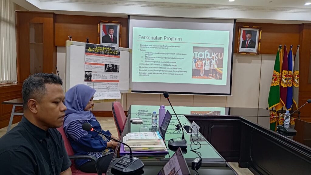 Terus kemarin saya presentasi mengenai pelatihan di Hiroshima di depan atasan-atasan saya. Ada pak rektor dan wakil-wakilnya. Ada dekan dari semua fakultas dan lain-lain. Waktu itu selain saya, ada 2 orang teman kerja yang presentasi juga. Mereka juga pernah ikut pelatihan yang sama seperti saya. 1 orang ikut pelatihan dari The Japan Foundation di Urawa, Saitama. 1 orang lagi ikut pelatihan yang diadain sama universitas Hiroshima. Pas presentasi saya minta ke pihak kampus untuk dukung kegiatan-kegiatan yang pernah saya ceritain sebelumnya. Respon pihak kampus, keliatannya sih ok ya. Mohon doanya ya. Sedikit-sedikit pasti bisa saya wujudkan jadi kenyataan!!