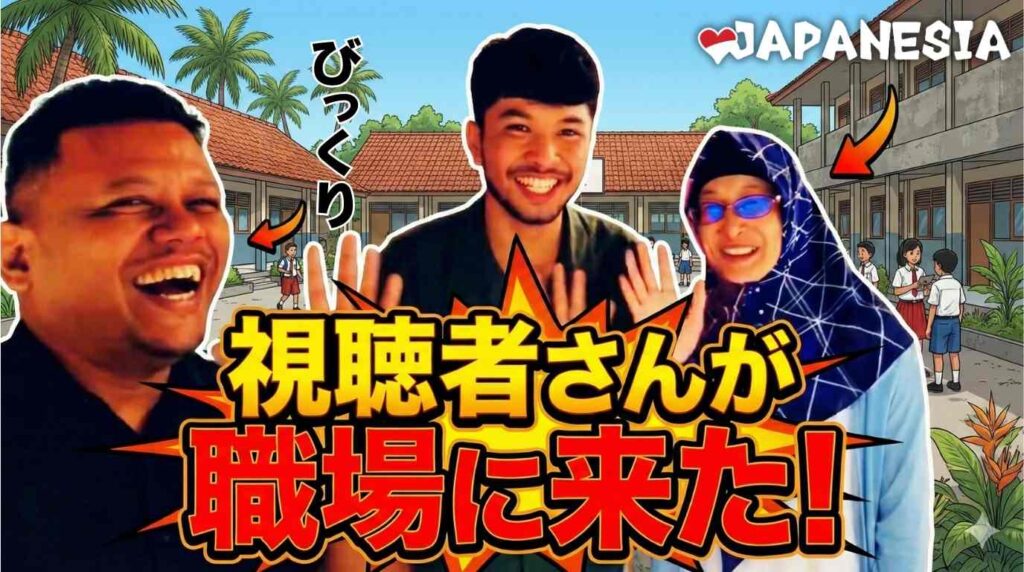 Terus kemarin ada penonton video Harinya Japanesia yang main ke tempat kerja saya. Kali ini penontonnya datang sama anak laki-lakinya. Katanya anak laki-lakinya sedang belajar tentang agama Islam di salah satu mesjid yang ada di daerah Bekasi. Kami ngobrol banyak tentang belajar bahasa Indonesia dan video Harinya Japanesia. Saya senang bisa dengar cerita dari sudut pandang mereka tentang video saya. Mereka ambil foto di tempat saya biasa ambil video. Saya juga sempat ajak mereka keliling kelas. Saya kenalin mereka ke mahasiswa. Mereka tinggal di daerah Bekasi. Kebetulan banyak mahasiswa saya yang tinggal di Bekasi juga. Siapa tahu mereka bisa main bareng.