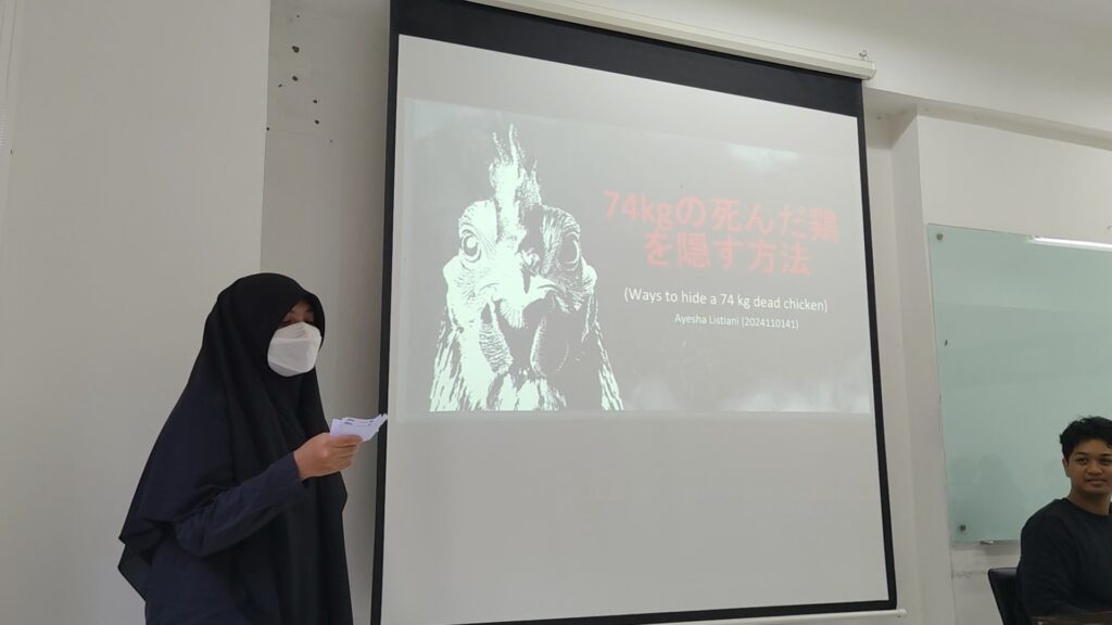 Terus kemarin seperti biasa saya dan mahasiswa adain sesi presentasi bahasa Jepang. Kali ini ada mahasiswa yang presentasi dengan tema lucu. Temanya adalah “Gimana caranya sembunyikan bangkai ayam seberat 74kg”. Gimana pas kalian dengar temanya? Kaget ya? Hehehe. Saya juga kaget, tapi isinya ternyata bukan beneran ya. Isinya ya cuma imajinasi si mahasiswa aja. Kayanya ya hahaha. Terus selain itu ada juga mahasiswa yang presentasi tentang grup idol kesukaannya. Mereka sampai tunjukin tarian grup idol itu di depan kelas lho. Oh ya, dari tanggal 4 sampai 8 Mei saya adakan sesi presentasi terbuka. Saya sudah umumin kegiatan ini di Japanesia. Untuk kalian yang tinggal di Jabodetabek, ayo main ke kampus saya untuk tonton presentasi mahasiswa ya.